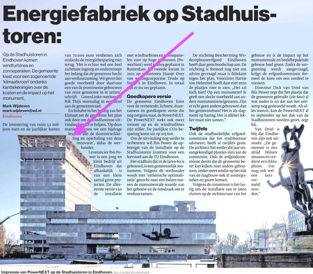 Hierbij tonen wij dan ook ons innovatieve voorstel om bovenop de luifel van de bushalte een middelhoge turbine te plaatsen die bij stevige westenwind zelfs meer stroom opwekt dan de geplande PowerNEXT installatie op de toren en de zonnepanelen op de laagbouw bij elkaar.